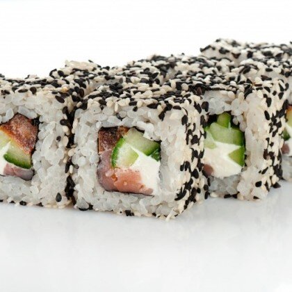 Нори, рис, креветка, огурец, лосось (в шапке), спайс-соус, кунжут.