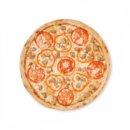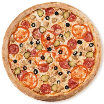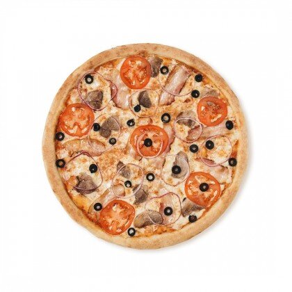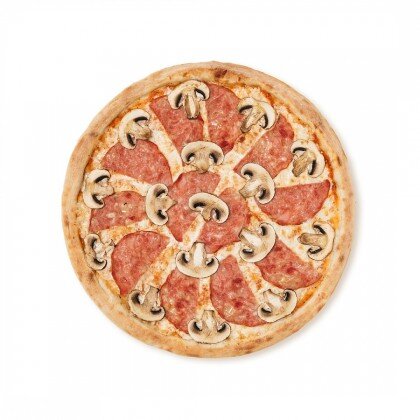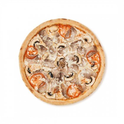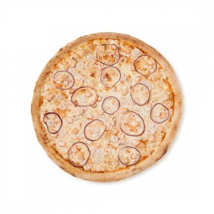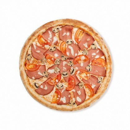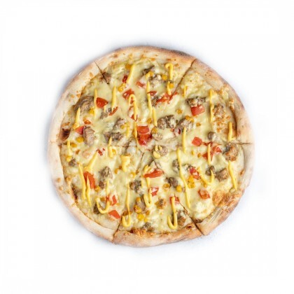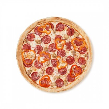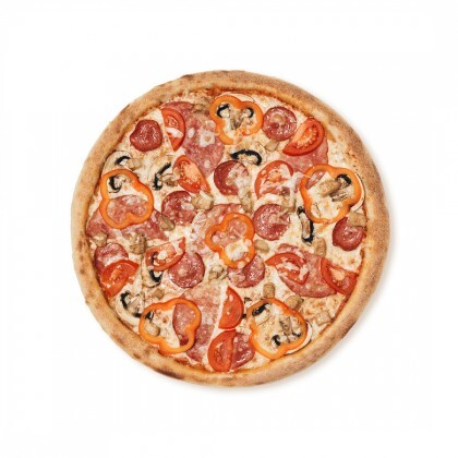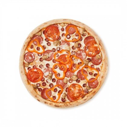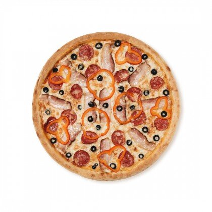 Тесто, соус, сыр, салями, ветчина, колбаски охотничьи, помидоры, соус барбекю.